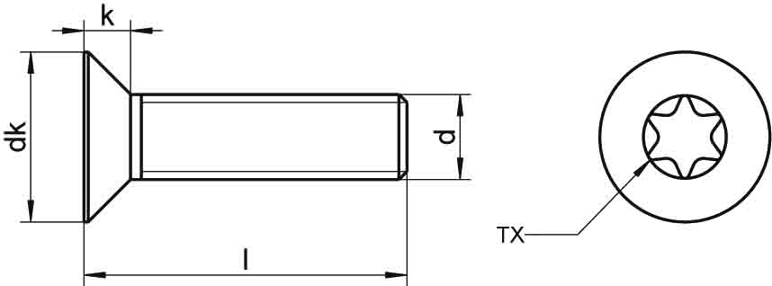 Vis métrique tête fraisée empreinte Torx. Disponible en inox A2 et A4